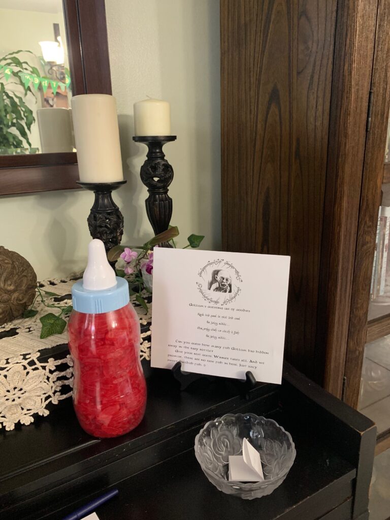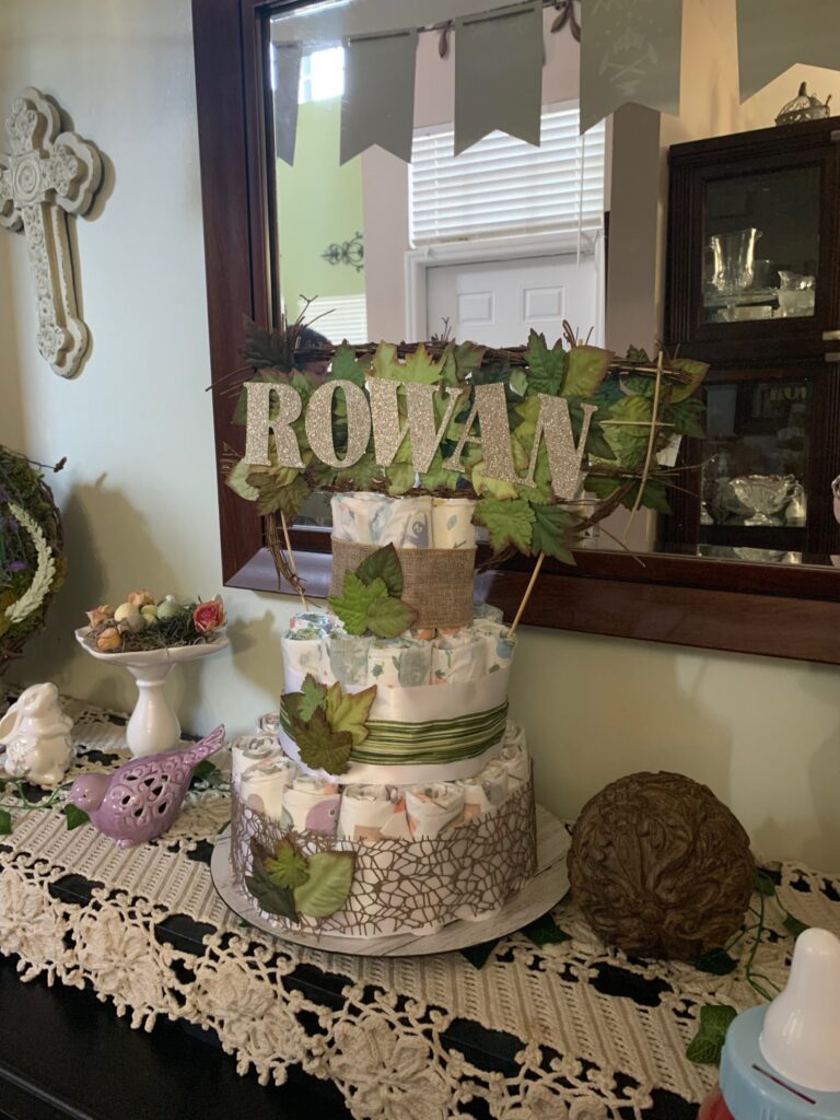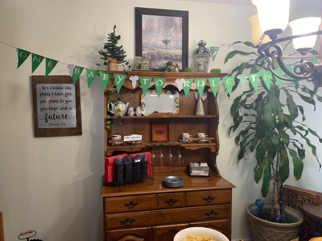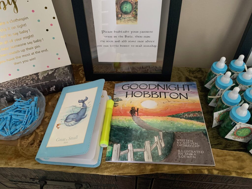Meagan and Rob like fantasy. They each have their own preference, because let’s face it, fantasy encompasses multiple, very different tastes. But they settled on a Hobbit/Lord of the Rings nursery theme, so we organized a Middle Earth shower.